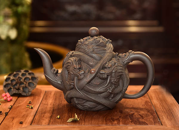 葛岳純父子皆擅長花貨的制作,其中家族代表作九龍至尊壺是由葛超美設(shè)計(jì),其父親葛岳純制作完成,遠(yuǎn)看壺型整體氣韻流暢,近看做工精美無暇,是父子合作的經(jīng)典之作,現(xiàn)已注冊外觀專利和終身版權(quán)。后葛超美在其父親傳統(tǒng)技法的基礎(chǔ)上,吸收其藝術(shù)菁華,創(chuàng)造革新,制作出更為精致、富有立體感的九龍至尊壺,九龍盤壺戲珠,浮雕云騰致雨,精致于細(xì)發(fā),大氣于天地,寓意天降祥瑞,國泰民安。